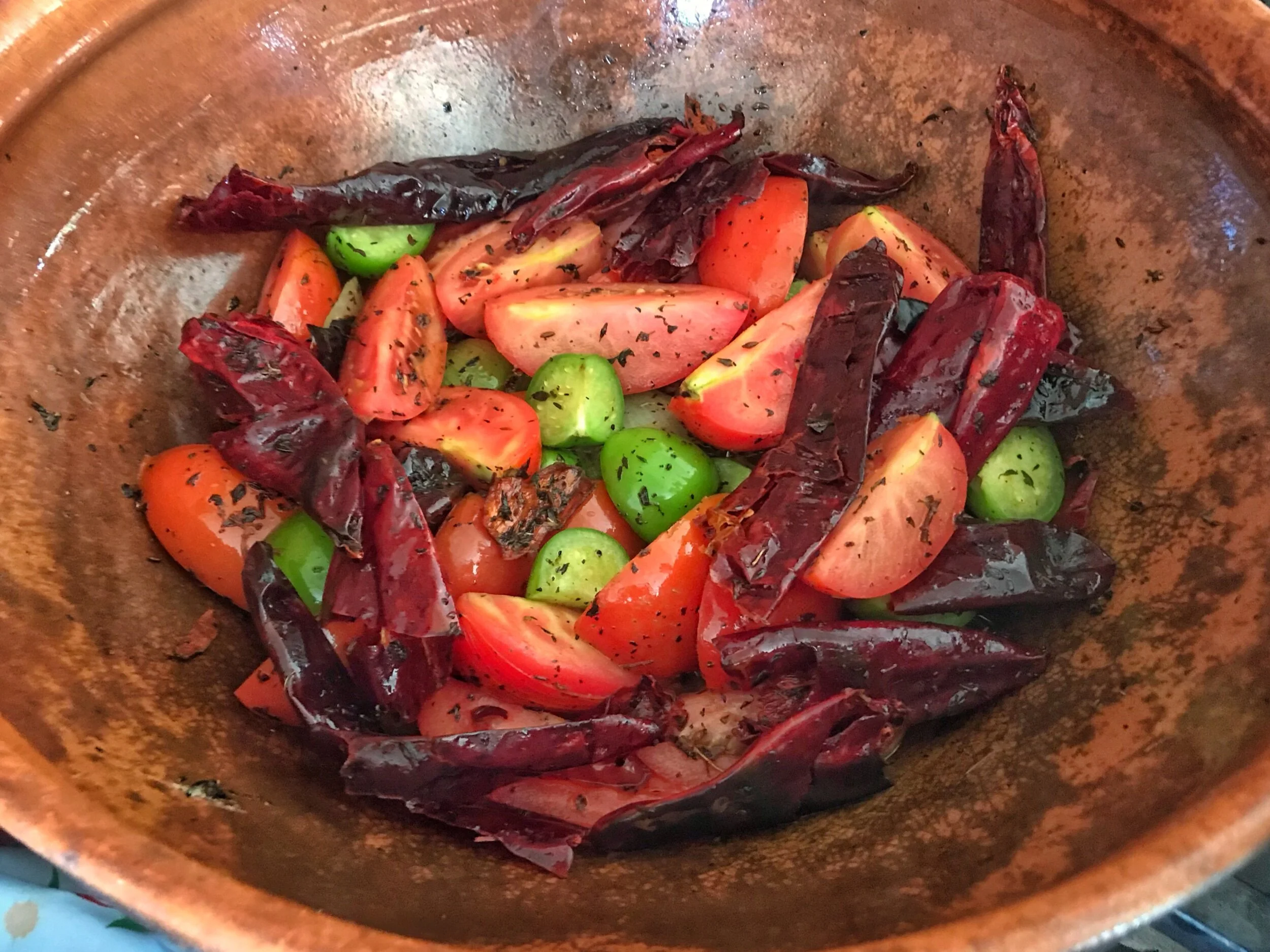 We roasted peppers, tomatoes, and tomatillos for mole amarillo , then took everything to the local mill to be pulverized.